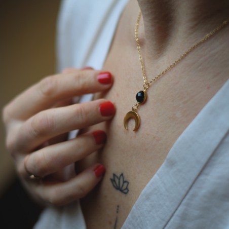Przepiękny, subtelny naszyjnik na delikatnym łańcuszku. Łącznik wypełniony kamieniem Onyks, a pod łącznikiem piękny, połyskujący półksiężyc Lunula. Całość magiczna i symboliczna.