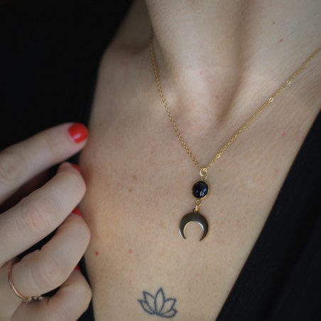 Przepiękny, subtelny naszyjnik na delikatnym łańcuszku. Łącznik wypełniony kamieniem Noc kairu, a pod łącznikiem piękny, połyskujący półksiężyc Lunula. Całość magiczna i symboliczna <3