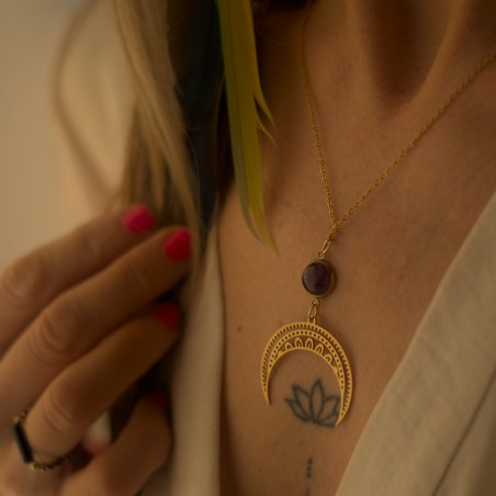 Naszyjnik "Mistyczna Luna" skomponowałam z urzekającego ametystu oraz ażurowej lunuli. Jego hipnotyzujące odcienie fioletu odzwierciedlają spokój, duchową świadomość i intuicję. Centralnym punktem jest zawieszka w kształcie półksiężyca, która symbolizuje kobiecą siłę i odrodzenie. Całość wykonana jest z trwałej stali chirurgicznej w kolorze złota, co zapewnia komfort noszenia nawet dla wrażliwej skóry oraz gwarantuje elegancki wygląd przez długi czas.