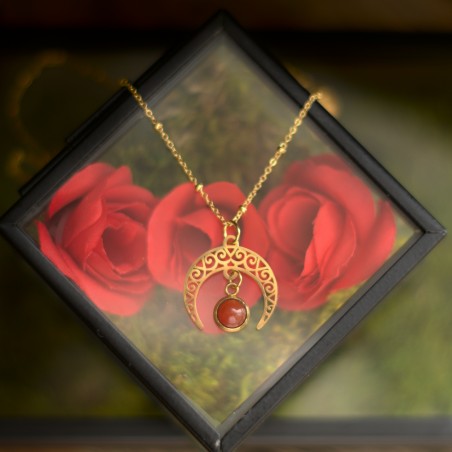 Połyskująca, ażurowa Lunula z Agatem. Całość na subtelnym łańcuszku zdobionym maleńkimi kuleczkami.