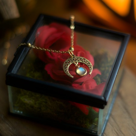 Połyskująca, ażurowa Lunula z Labradorytem. Całość na subtelnym łańcuszku zdobionym małymi kuleczkami.