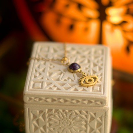 Połyskujące Oko Proroka z magicznym Ametystem. Całość na subtelnym łańcuszku zdobionym maleńkimi kuleczkami.