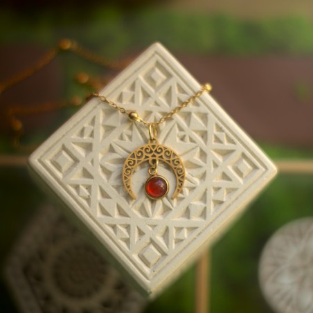 Połyskująca, ażurowa lunula z kamieniem agat. Całość na subtelnym łańcuszku zdobionym maleńkimi kuleczkami.