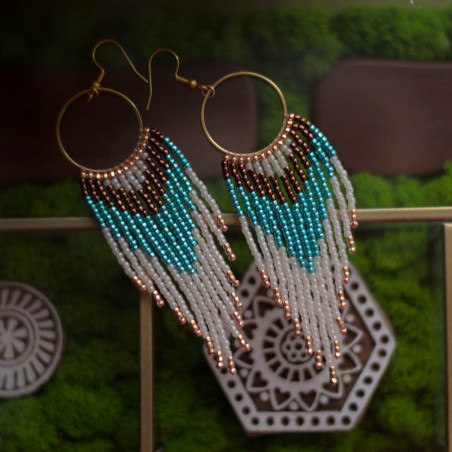 Te wyjątkowe, długie kolczyki to rękodzieło z duszą, które stworzyłam z myślą o kobietach ceniących oryginalność i subtelną elegancję. Łączą w sobie surowość kolorów ziemi z lekkością błękitu, tworząc kompozycję idealną zarówno na co dzień, jak i na specjalne okazje. Precyzyjny splot i delikatnie pracujące frędzle dodadzą unikalnego charakteru każdej Twojej stylizacji.