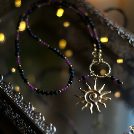 Fantazyjne Wykończenie: Naszyjnik posiada ozdobne zapięcie na młotkowanym kółeczku, przy którym oprócz słońca znajdziesz dwie mniejsze, wykonane przeze mnie zawieszki z rubinu i onyksu. To bogate, kaskadowe wykończenie przyciąga wzrok.