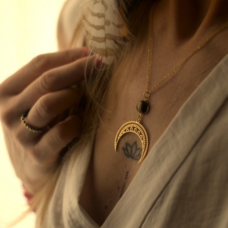 Naszyjnik skomponowałam z myślą o sile, pewności siebie i harmonii z cyklami natury. Centralnym punktem biżuterii jest zawieszka w kształcie ażurowego półksiężyca (lunuli), zwieńczona naturalnym kamieniem Tygrysiego Oka. Ten kamień o głębokim, miodowo-brązowym blasku, mieniący się złotymi refleksami, jest symbolem odwagi i jasności umysłu. Całość naszyjnika wykonana jest z wysokiej jakości stali chirurgicznej w kolorze złota, co zapewnia trwałość, elegancki wygląd oraz bezpieczeństwo dla wrażliwej skóry.