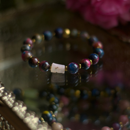 Umieszczony w sercu bransoletki surowy słupek Opalu Peruwiańskiego to symbol głębokiej intuicji, spokoju i połączenia z własnym wnętrzem. Ten niezwykły minerał wycisza emocje i sprzyja duchowemu rozwojowi. Jego delikatny blask przypomina o gwiezdnym pyle i mądrości, którą każda z nas nosi w sobie.